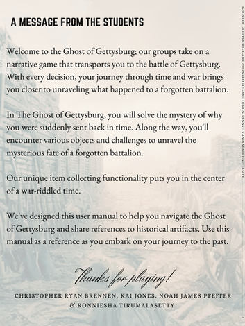 For my final project in Game Design at Penn State University, I collaborated with a team to conceptualize and develop Ghost of Gettysburg, a text-based exploration game that takes players back to the historic Battle of Gettysburg. The project focused on narrative depth, player choice, and historical immersion, with a strong emphasis on storytelling.